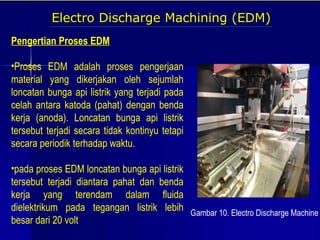 Asal mula EDM Electrical Discharge Machining adalah pada tahun 1770 ketika ilmuwan Inggris Joseph Priestly menemukan efek erosi dari percikan arus listrik. Electric discharge machining EDM is the removal of materials conducting electricity by an electrical discharge between two electrodes Workpiece and tool a dielectric fluid being used in the process. Dua proses utama yang termasuk dalam katagori ini adalah.